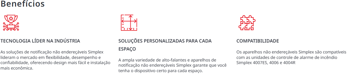 Soluções simplex incluem cornetas, estroboscópios, cornetas-estroboscópicas, alto-falantes, alto-falantes-estroboscópicos, sinos, sinos-estroboscópicos, cornetas multitons, cornetas multitons-estroboscópicas e mini-cornetas.