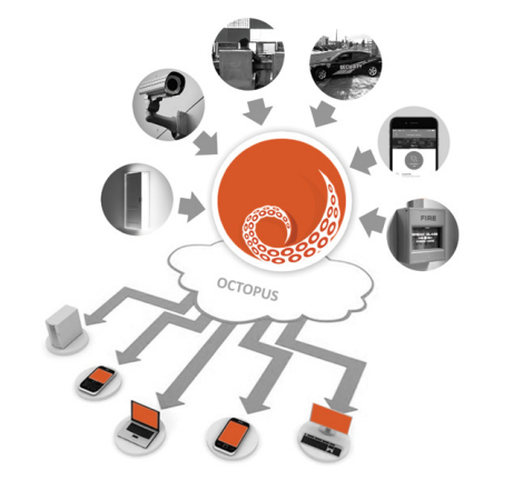 O software OCTOPUS pode interagir com todos os sistemas de segurança e dados da sua organização, incluindo alarmes, prevenção de fraudes, alertas de ataques cibernéticos, sensores de segurança, monitoramento de entrada e câmeras de circuito fechado, bem como inteligência de código aberto e mídias sociais. Essa integração aprimora a consciência situacional, melhora o tempo de resposta e aumenta a eficiência.